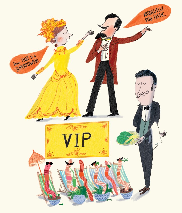 No, there wasn’t any (although I did write a few illustration notes). My publishers had an idea that Gwen would be perfect for the text and luckily she was able to fit me in! When I saw the illustrations I was blown away and reached out to thank her. Luckily I hadn’t really pictured anything in great detail, so it was a wonderful surprise. I also knew the text was a huge challenge to illustrate, with worms not having eyes, for example, so Gwen’s use of glasses on the worms was really great.